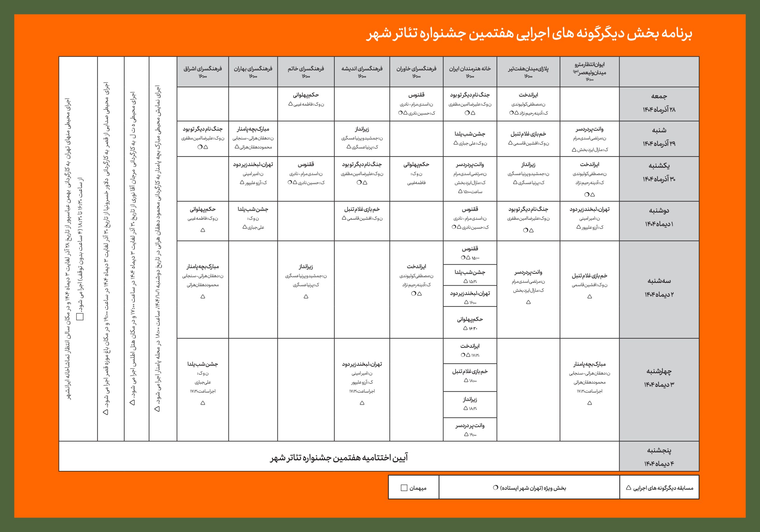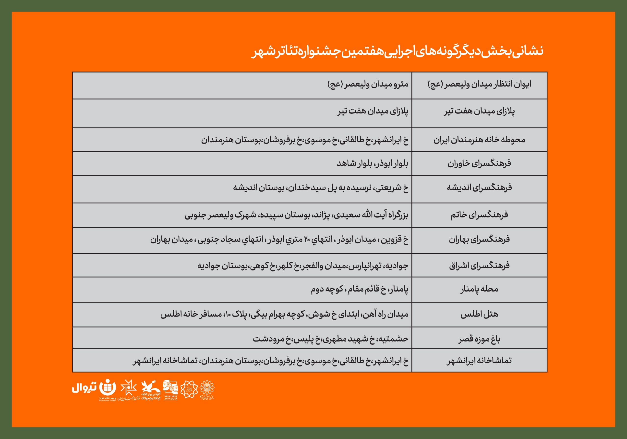 بخش دیگرگونههای اجرایی جشنواره با هدف گسترش تئاتر در فضاهای شهری، از ۲۸ آذر تا ۳ دی طبق جدول در نقاط مختلف تهران میزبان مخاطبان خواهد بود.
