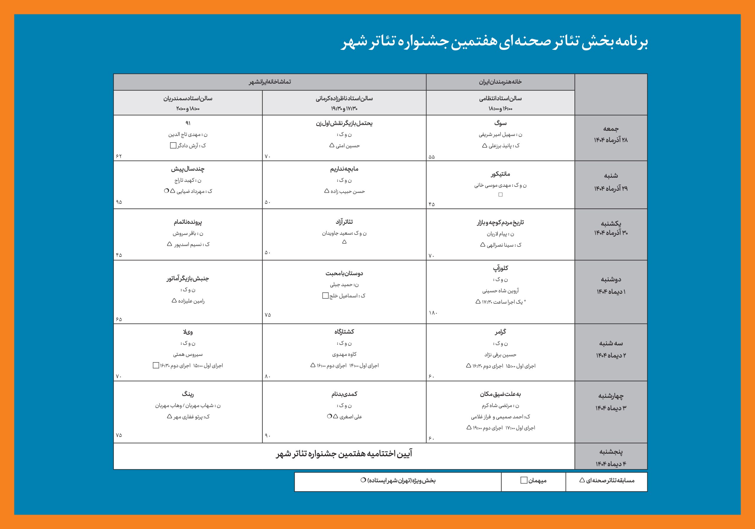 آثار دو بخش از هفتمین جشنواره تئاتر «شهر» از 28 آذر 1404، در سالن استاد انتظامی و محوطه ورودی خانه هنرمندان ایران روی صحنه میرود.